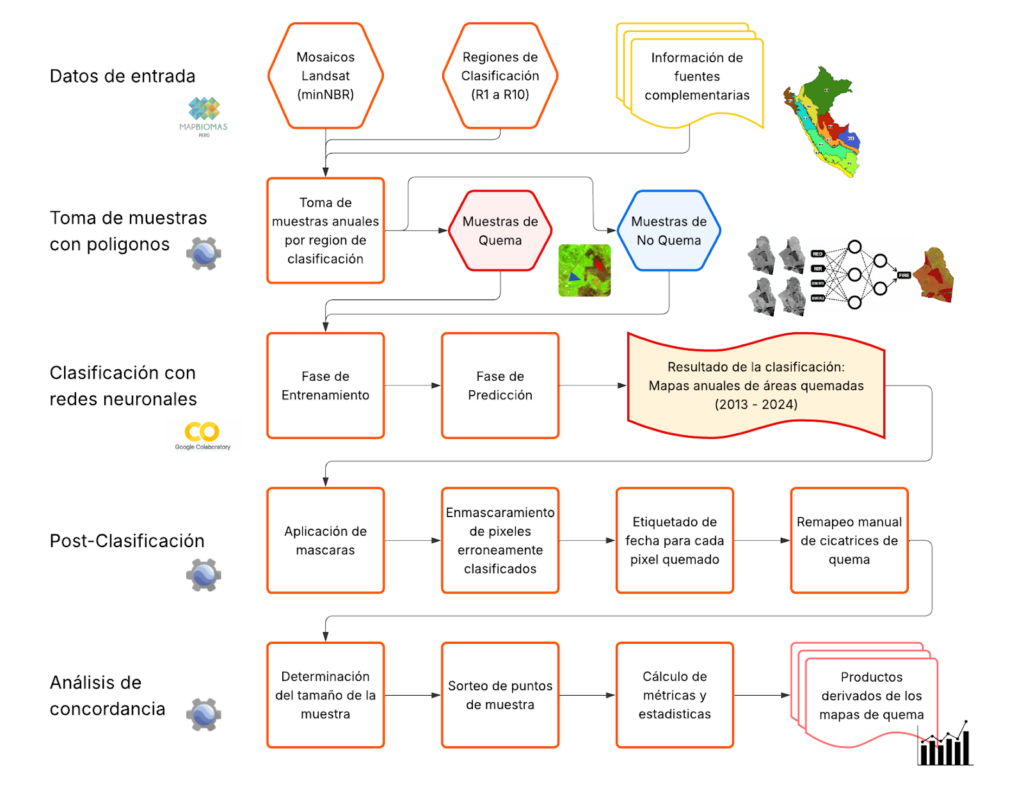 La metodología para el mapeo de áreas quemadas se basa en el procesamiento de imágenes satelitales en la nube, mediante la toma de muestras de pixeles de quema en mosaicos clasificados Landsat con nivel de corrección Tier 1 (30m × 30m) en todo el periodo de estudio (2013 al 2024). Este proceso se hace para las 10 regiones de clasificación, asegurando la representación de las distintas características espectrales presentes en cada región