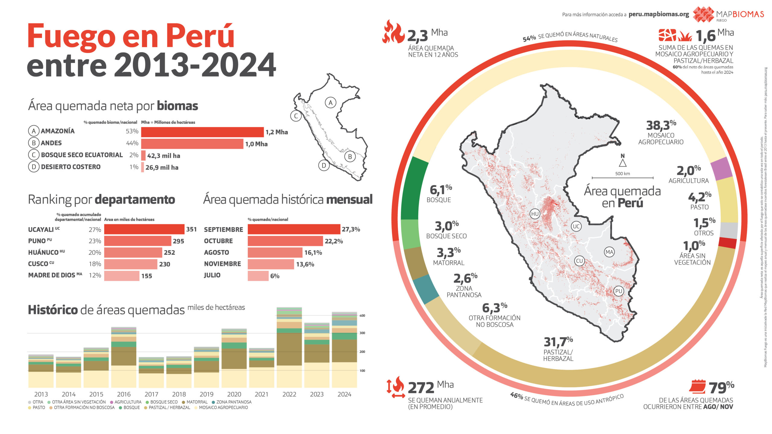 La Colección 1.0 de MapBiomas Fuego presenta el mapeo anual de las áreas quemadas (cicatrices de incendios) en el territorio peruano desde 2013 hasta 2024, incluyendo: (a) Área quemada anual (b) Área quemada mensual (c) Frecuencia de incendios (d) Área quemada acumulada (e) Tamaño de las cicatrices de incendios (f) Año del último incendio. Los datos anuales, acumulativos y de frecuencia también están disponibles por clases de cobertura y uso del suelo en la Colección 3.0 de MapBiomas Perú.